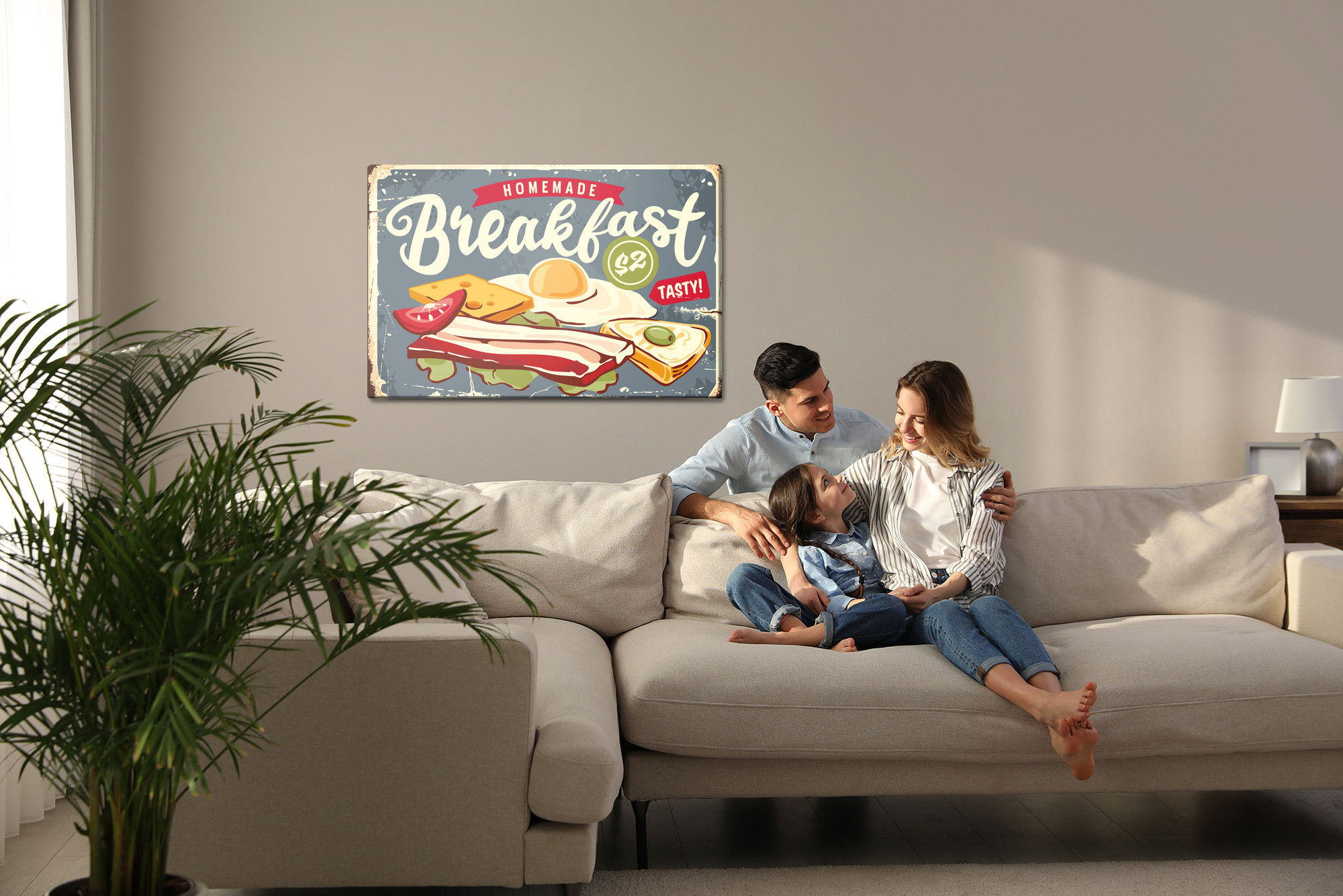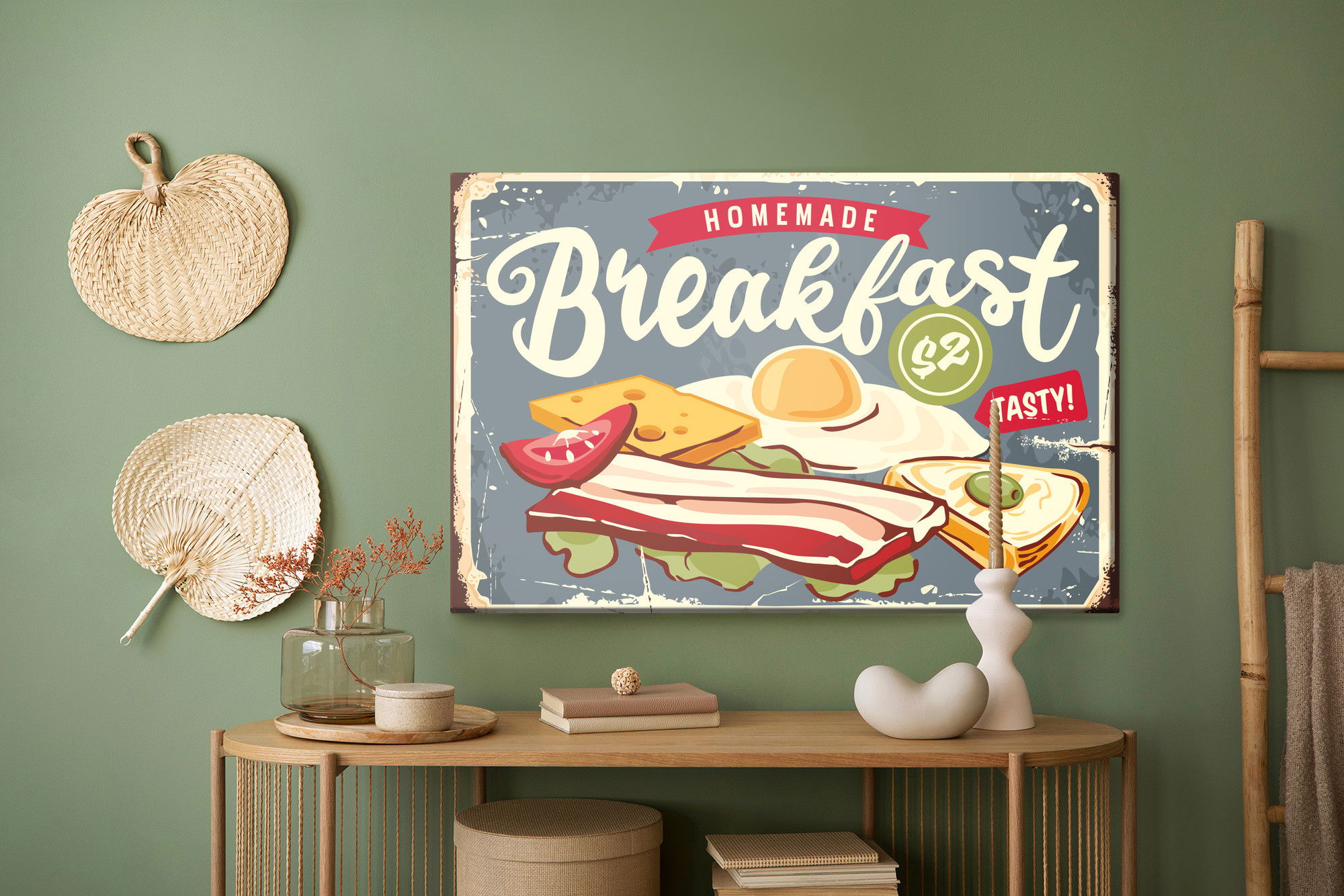 Varje tavla monteras på en massiv fururam. Format upp till 70×50 cm har en ram på 15 mm, medan format från 90×60 cm och uppåt har en ram på 20 mm. Den exakta dukspänningen gör att tavlan håller sin form över tid. Motivet A nutritious breakfast trycks runt hela ramen vilket ger ett stilrent galleriuttryck där tavlan är lika vacker från sidan som framifrån. Kombinationen av rak dukspänning, rena linjer och korrekt tryck ger en professionell finish.