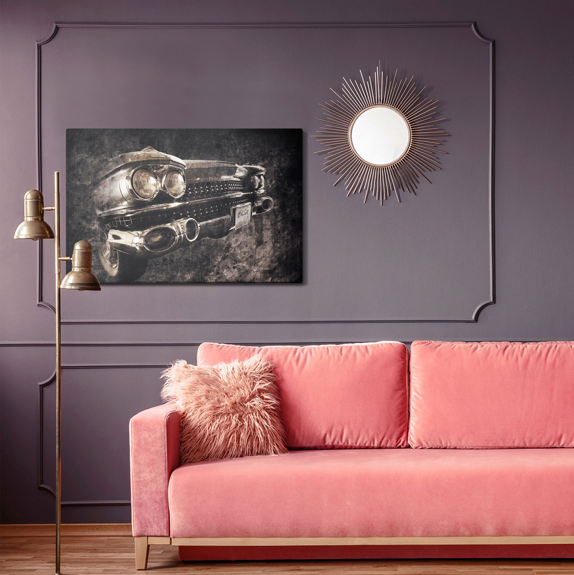 SilentDirects ljuddämpande tavla American vintage car kombinerar ett högupplöst motiv med avancerad akustikteknik. Varje tavla monteras i Sverige och bygger på en stabil canvastavla med fururam, där insidan av ramen fylls med en ljudabsorberande kärna av återvunnen polyester. Konstruktionen gör tavlan till ett både estetiskt och funktionellt inslag i rummet.