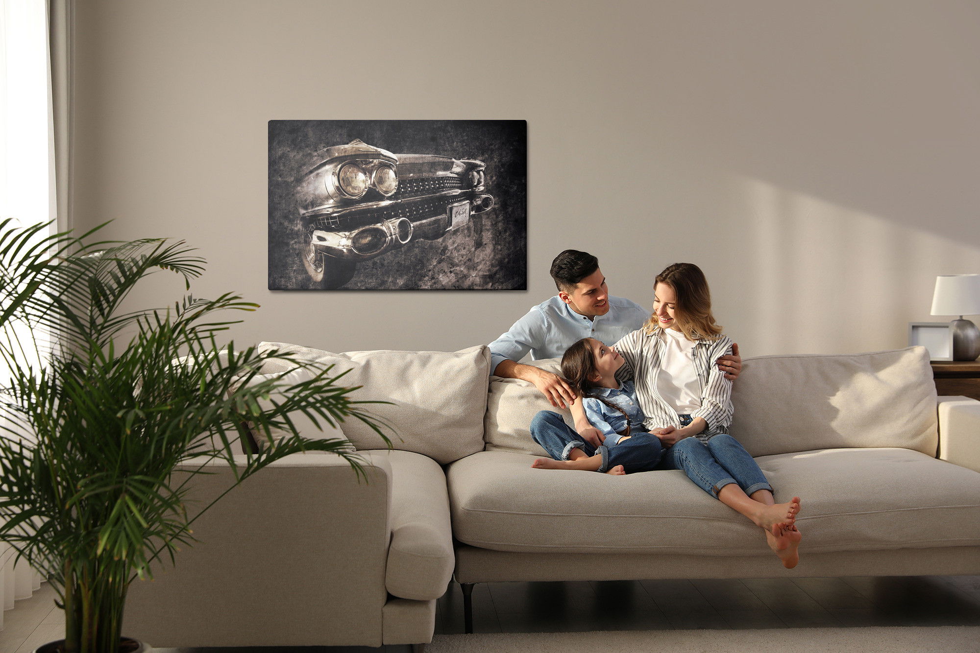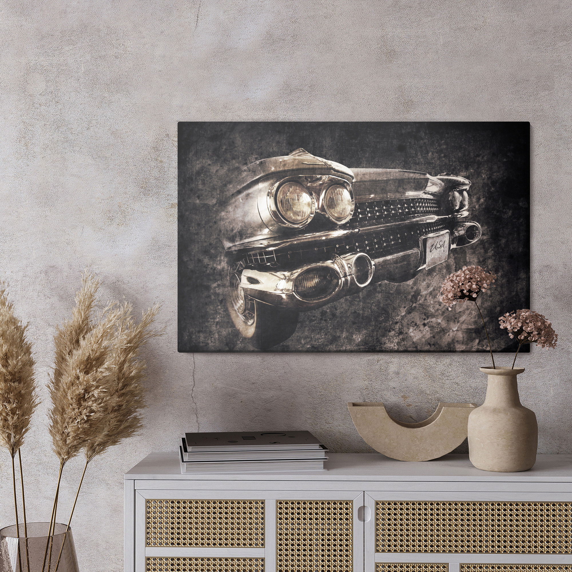 Varje tavla monteras på en massiv fururam. Format upp till 70×50 cm har en ram på 15 mm, medan format från 90×60 cm och uppåt har en ram på 20 mm. Den exakta dukspänningen gör att tavlan håller sin form över tid. Motivet American vintage car trycks runt hela ramen vilket ger ett stilrent galleriuttryck där tavlan är lika vacker från sidan som framifrån. Kombinationen av rak dukspänning, rena linjer och korrekt tryck ger en professionell finish.