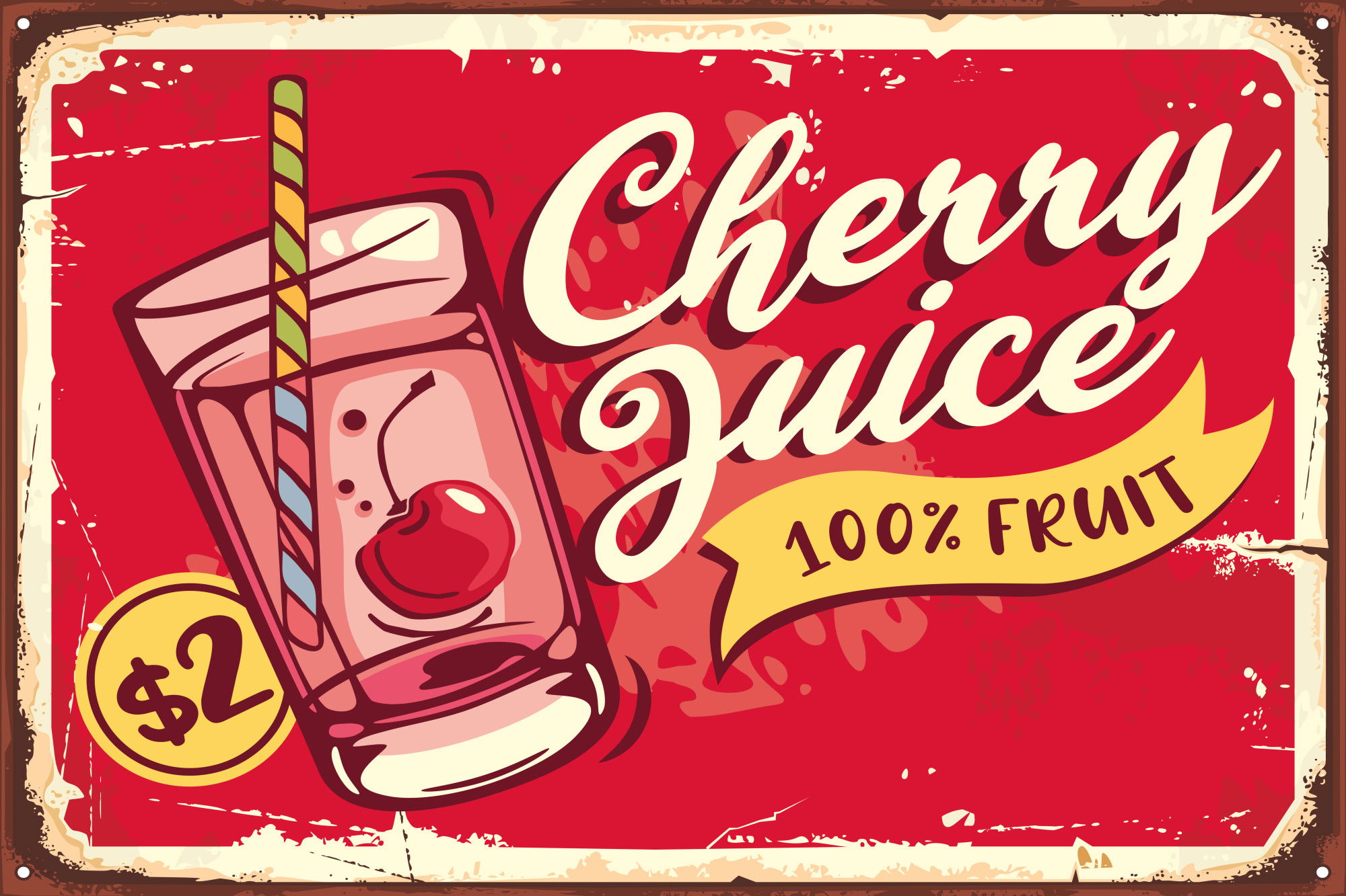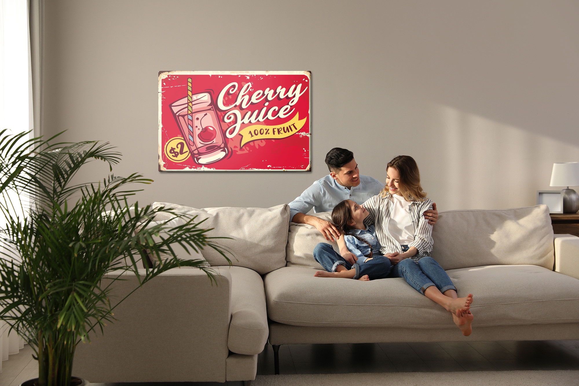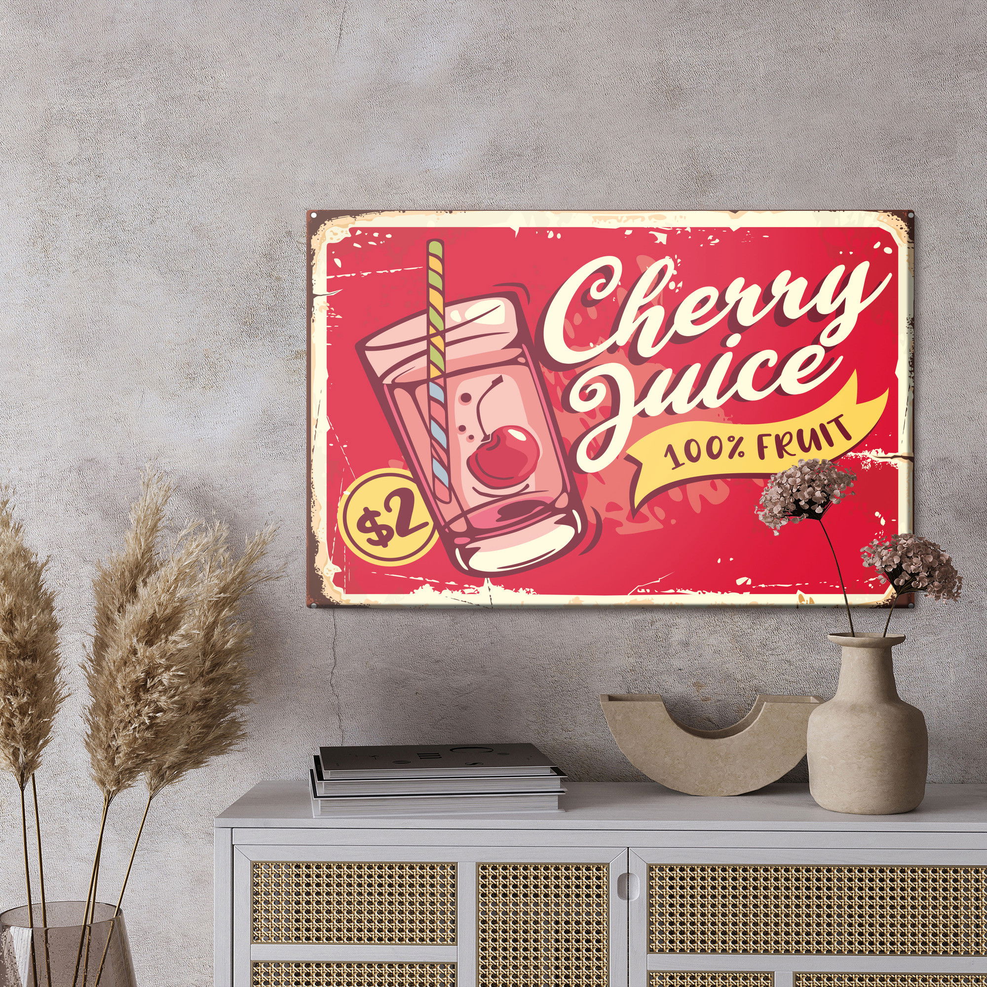 Motivet Cherry juice and retro återges med hög färgprecision och detaljrikedom tack vare HP Latex-teknologi. Trycket sker med vattenbaserade, luktfria och GREENGUARD Gold-certifierade bläck som ger en upplösning på upp till 300 DPI. Färgerna är UV-beständiga och behåller sin styrka även i ljusa rum, vilket gör tavlan lämplig för både hem- och offentliga miljöer.