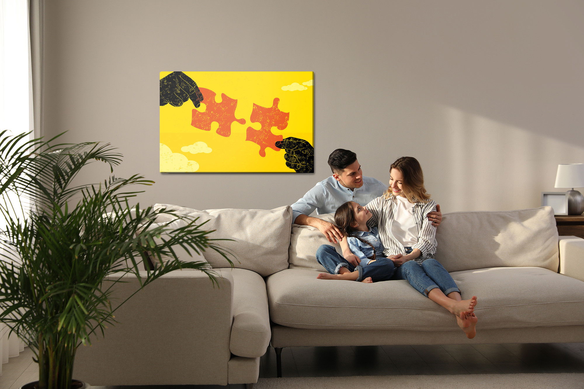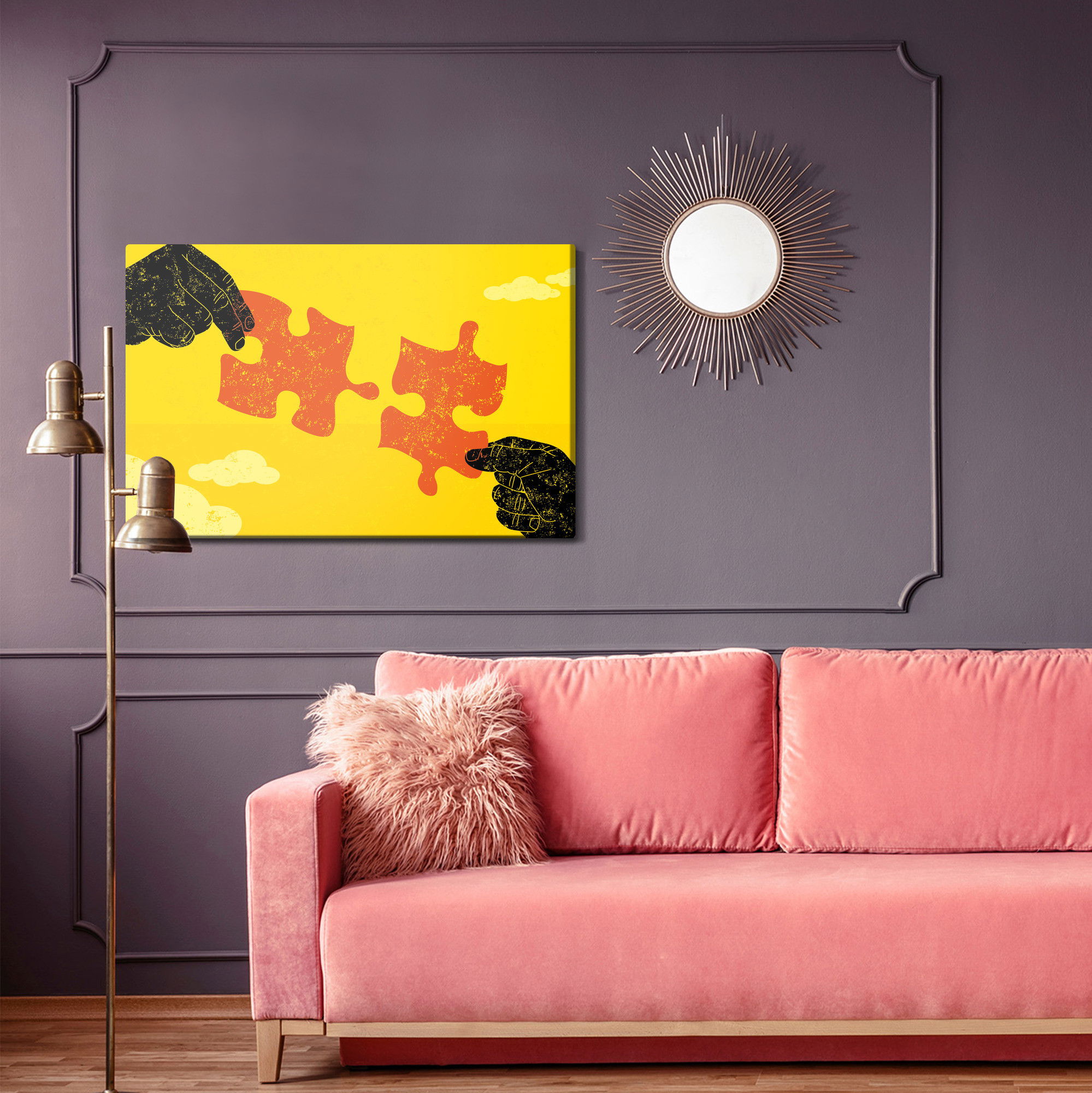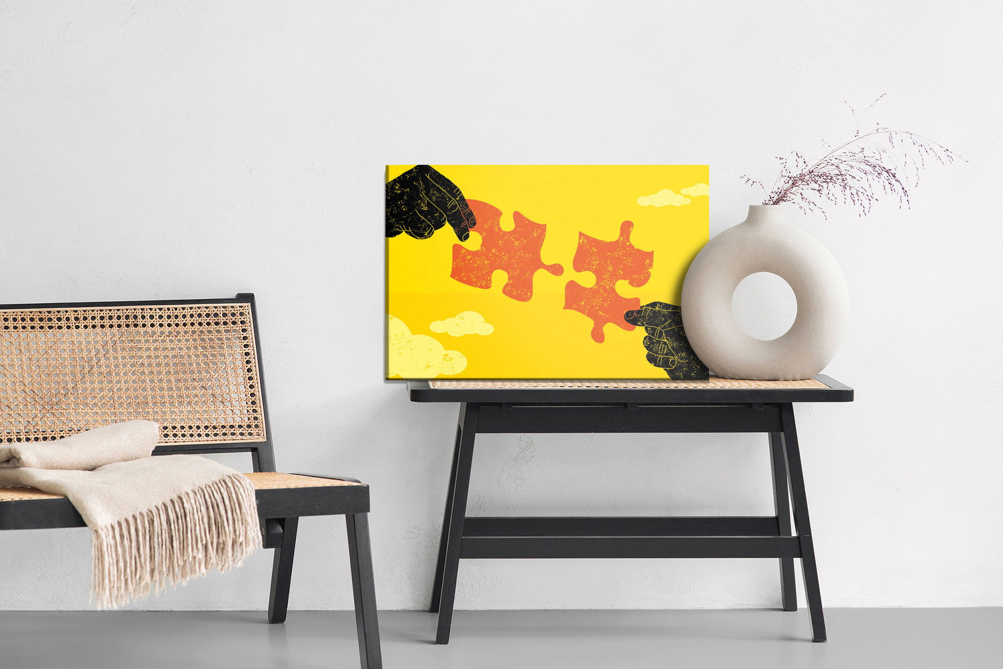 Varje tavla monteras på en massiv fururam. Format upp till 70×50 cm har en ram på 15 mm, medan format från 90×60 cm och uppåt har en ram på 20 mm. Den exakta dukspänningen gör att tavlan håller sin form över tid. Motivet Connecting vintage puzzle trycks runt hela ramen vilket ger ett stilrent galleriuttryck där tavlan är lika vacker från sidan som framifrån. Kombinationen av rak dukspänning, rena linjer och korrekt tryck ger en professionell finish.