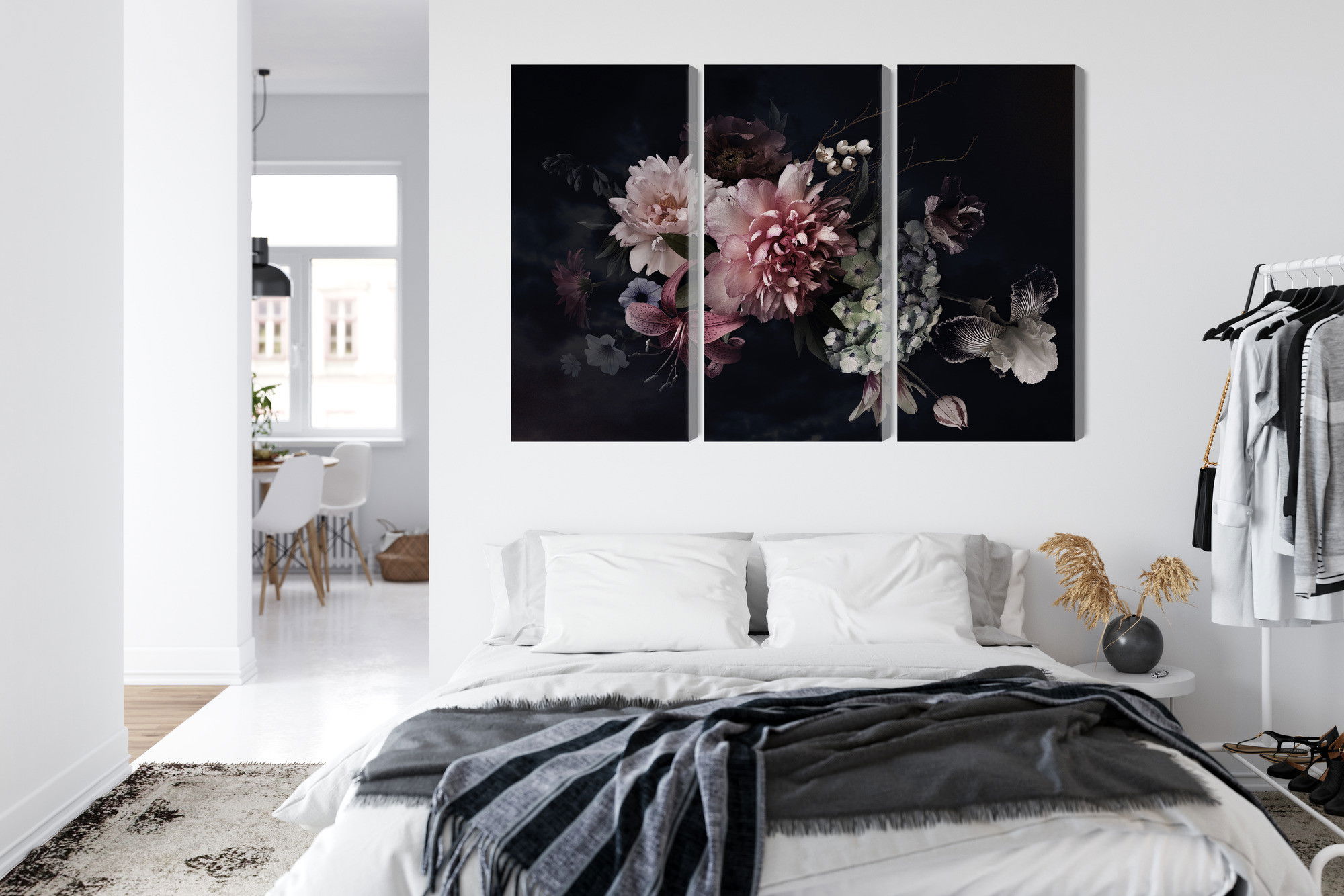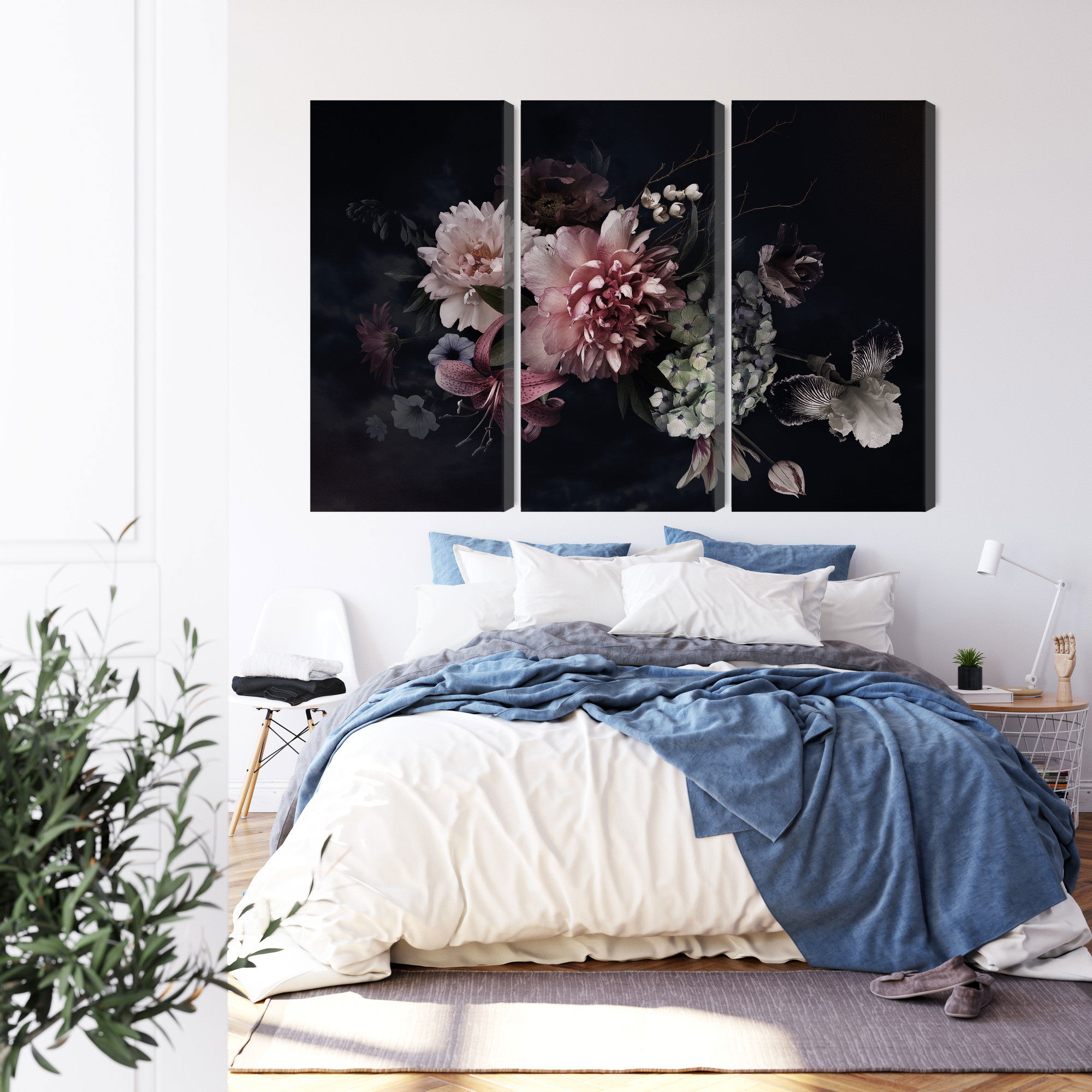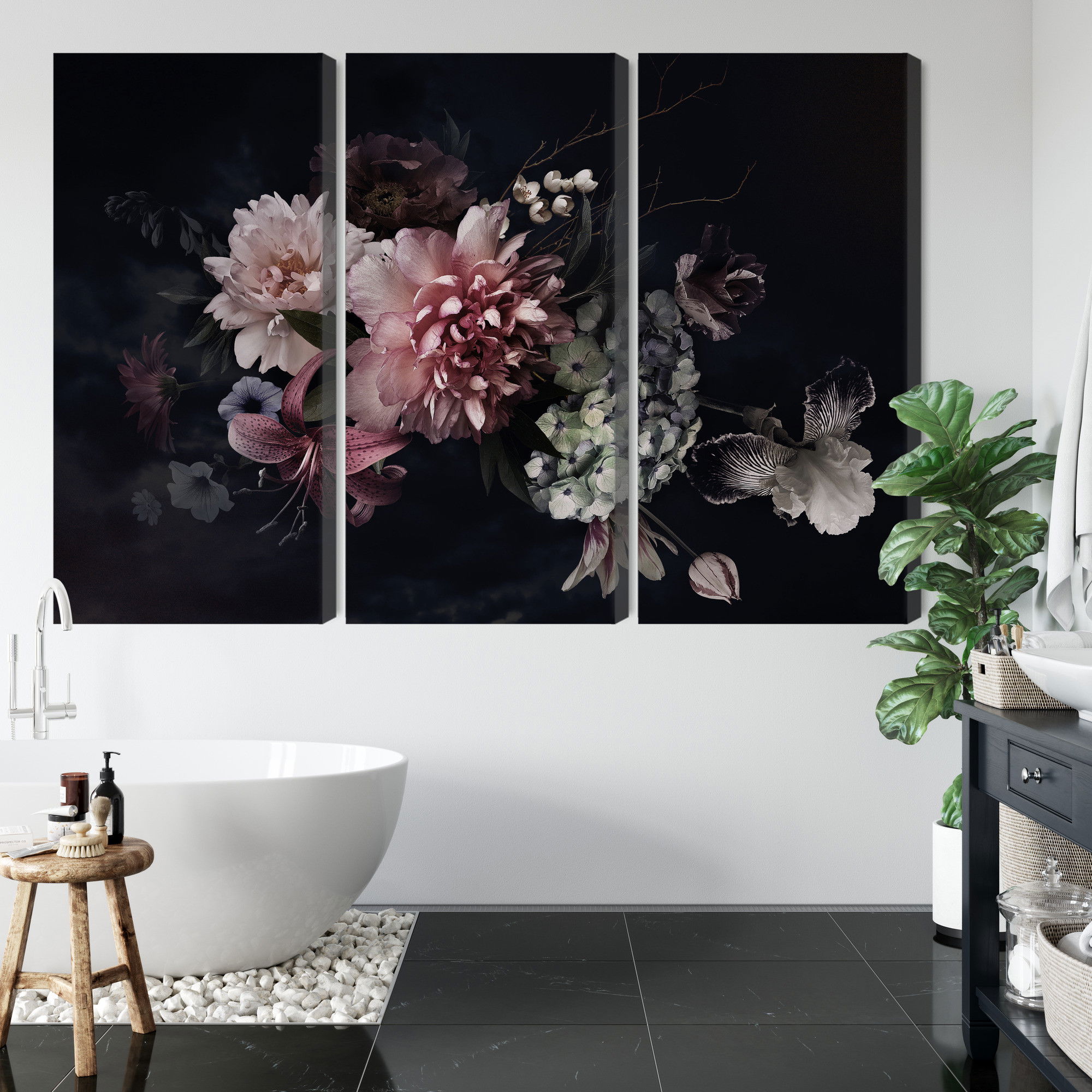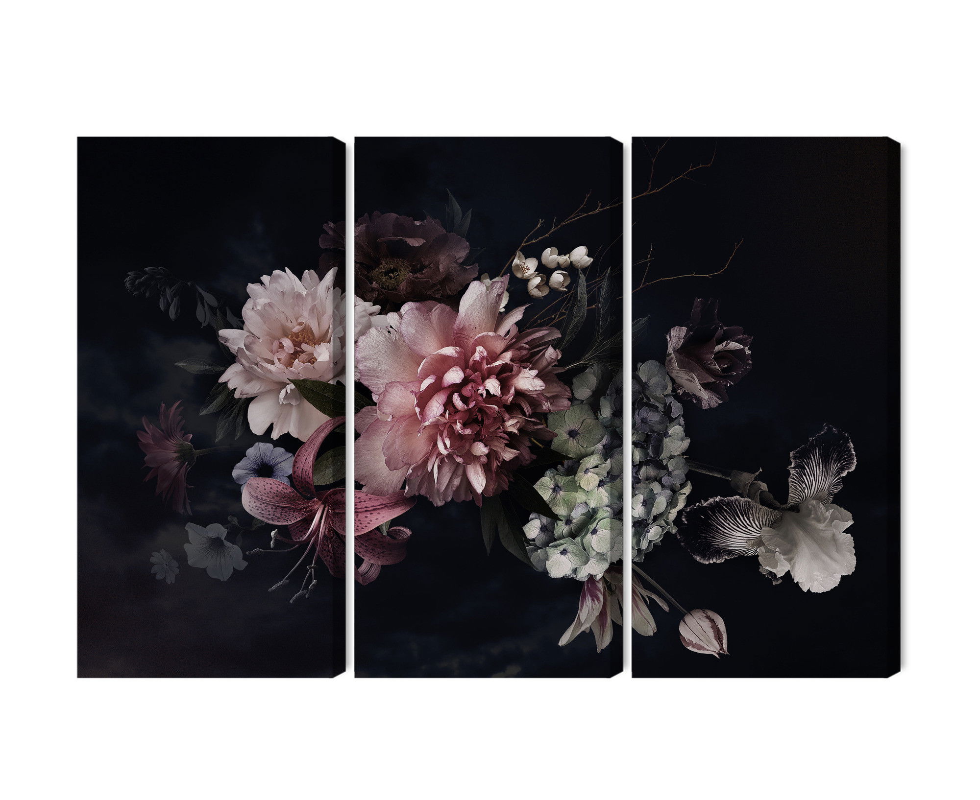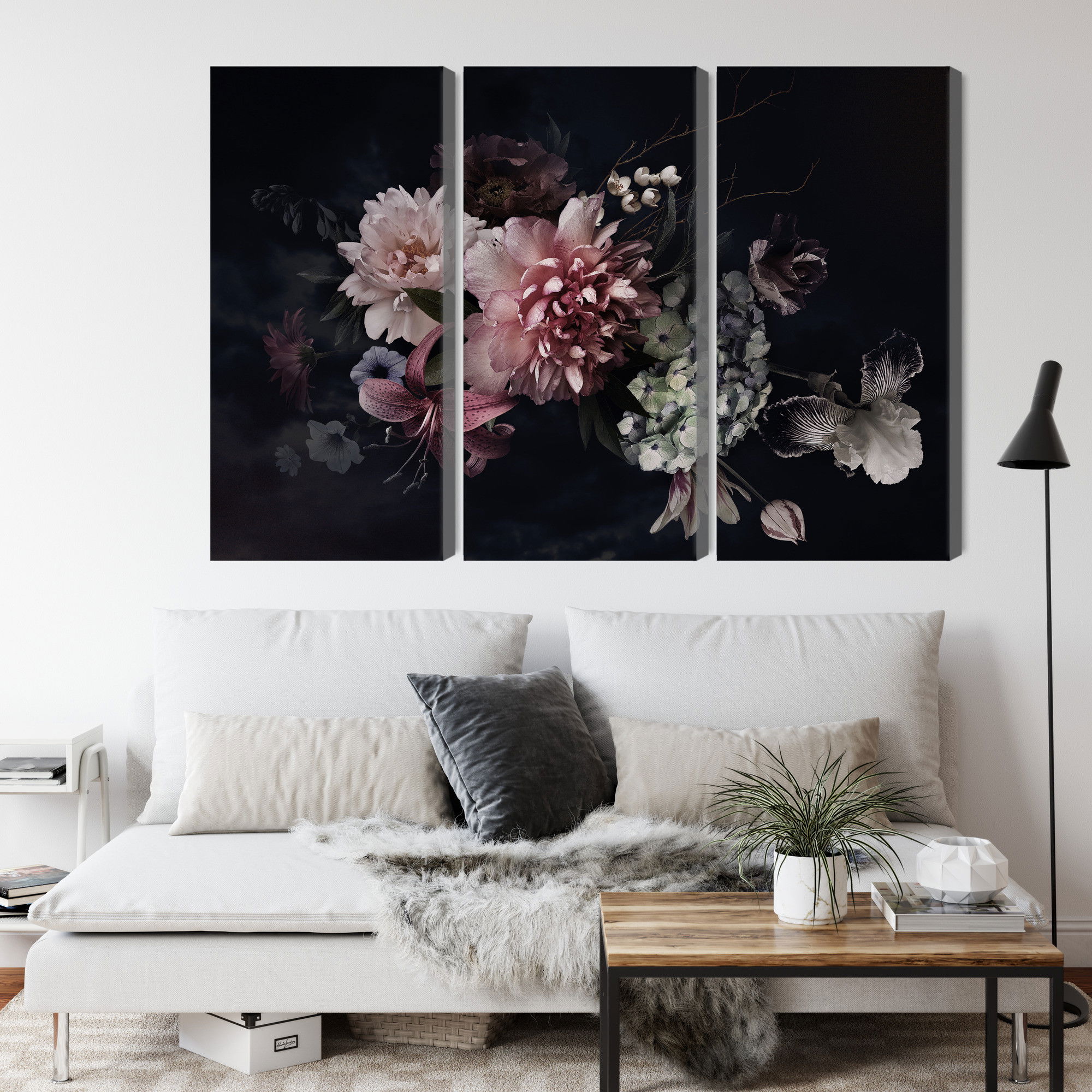 Varje tavla monteras på en massiv fururam. Format upp till 70×50 cm har en ram på 15 mm, medan format från 90×60 cm och uppåt har en ram på 20 mm. Den exakta dukspänningen gör att tavlan håller sin form över tid. Motivet Flowers in vintage style trycks runt hela ramen vilket ger ett stilrent galleriuttryck där tavlan är lika vacker från sidan som framifrån. Kombinationen av rak dukspänning, rena linjer och korrekt tryck ger en professionell finish.