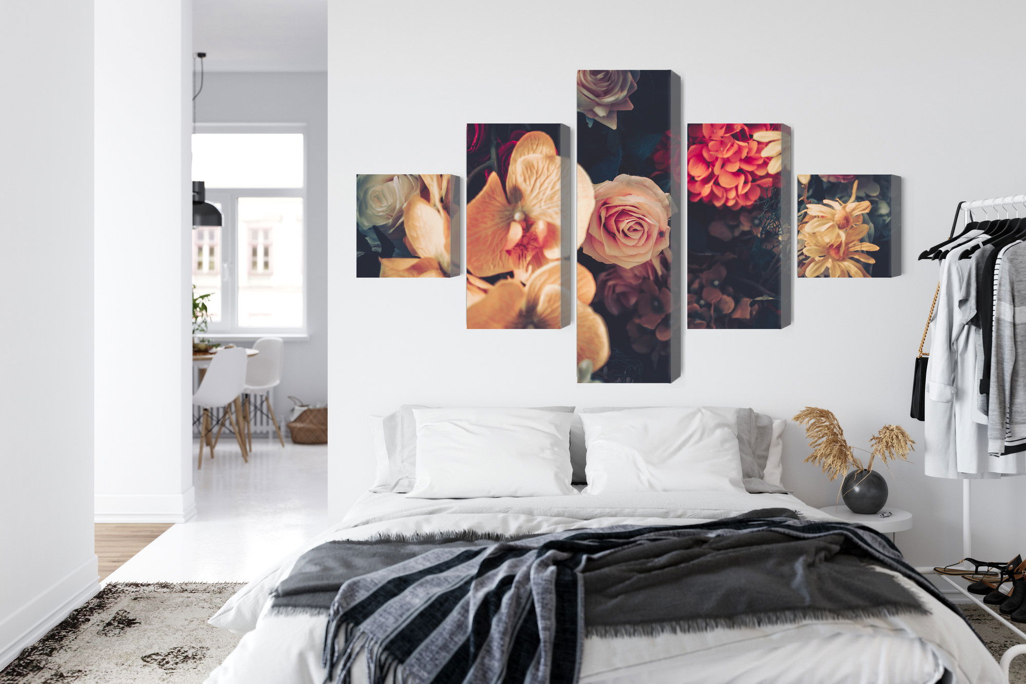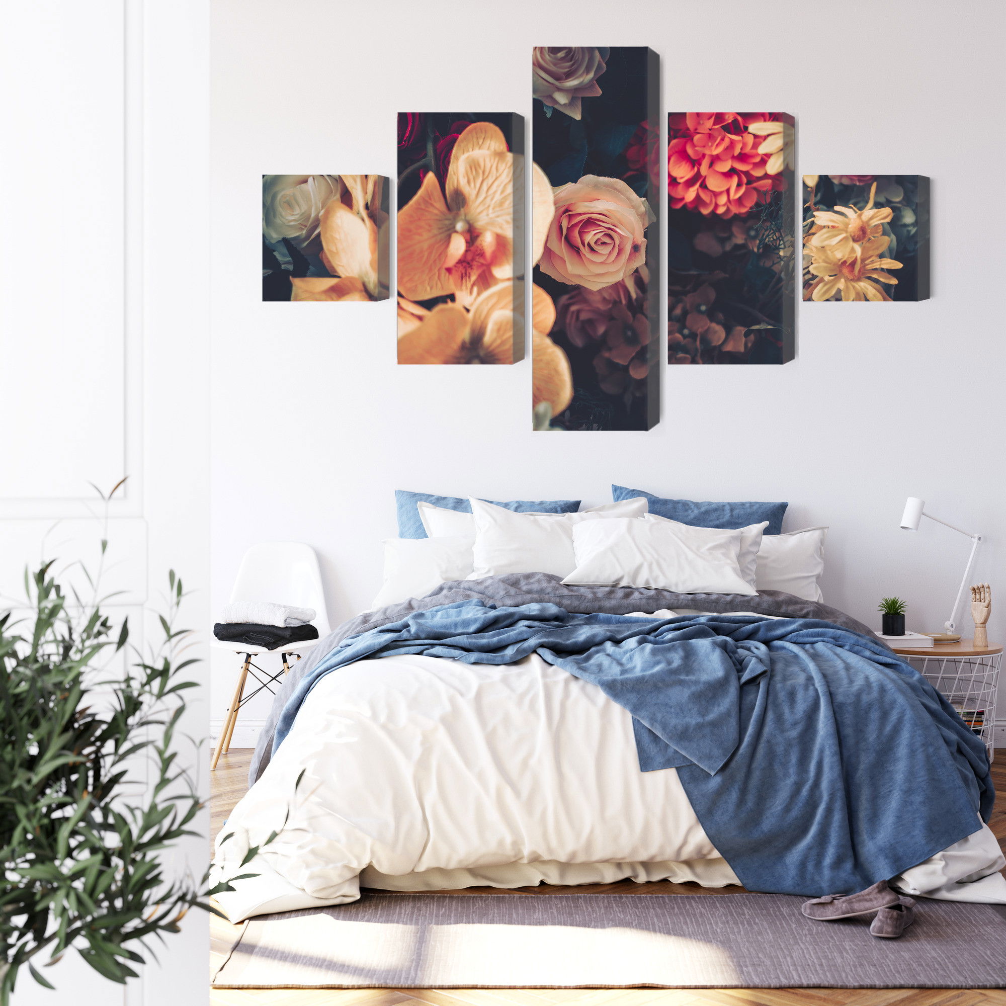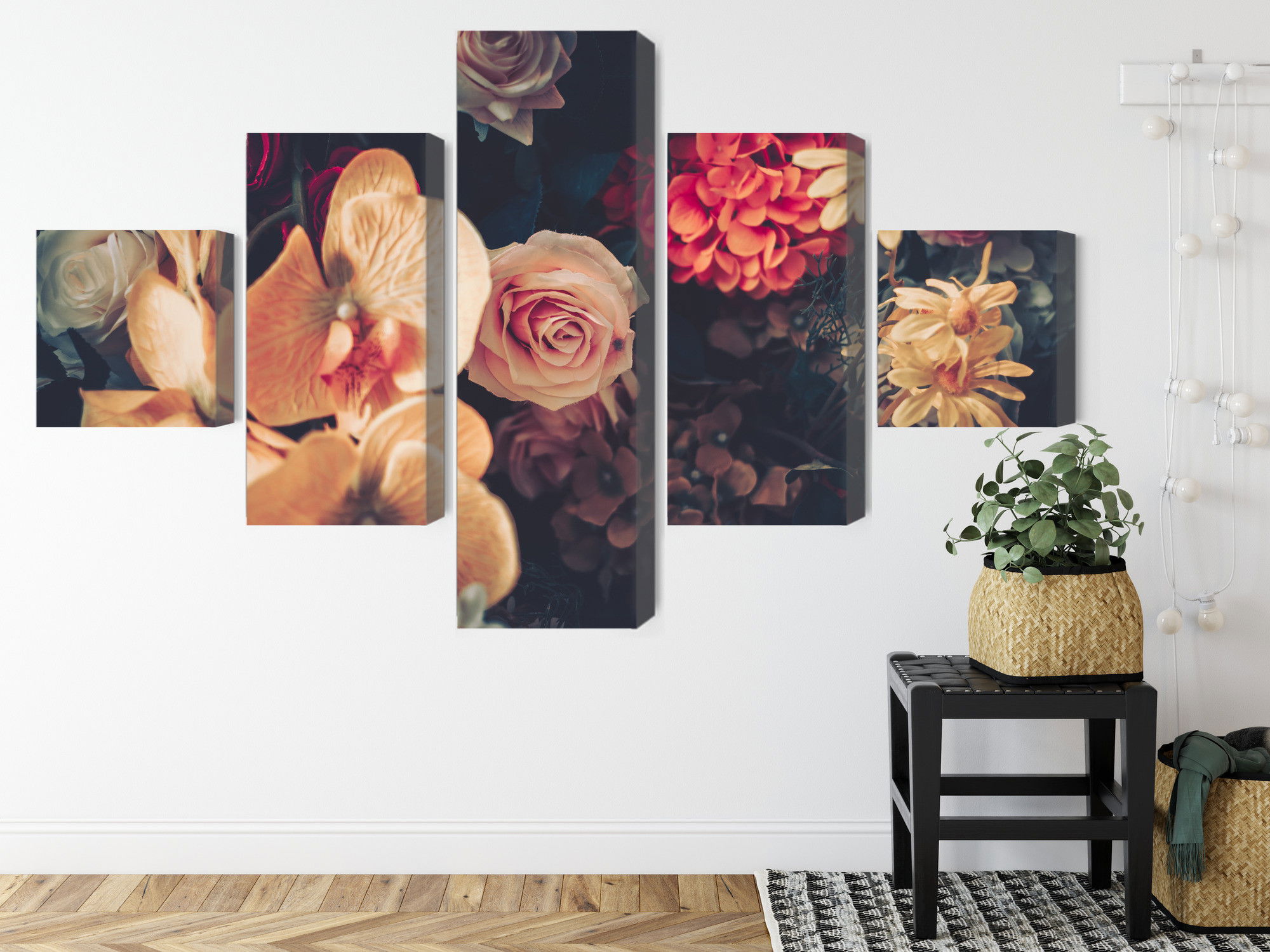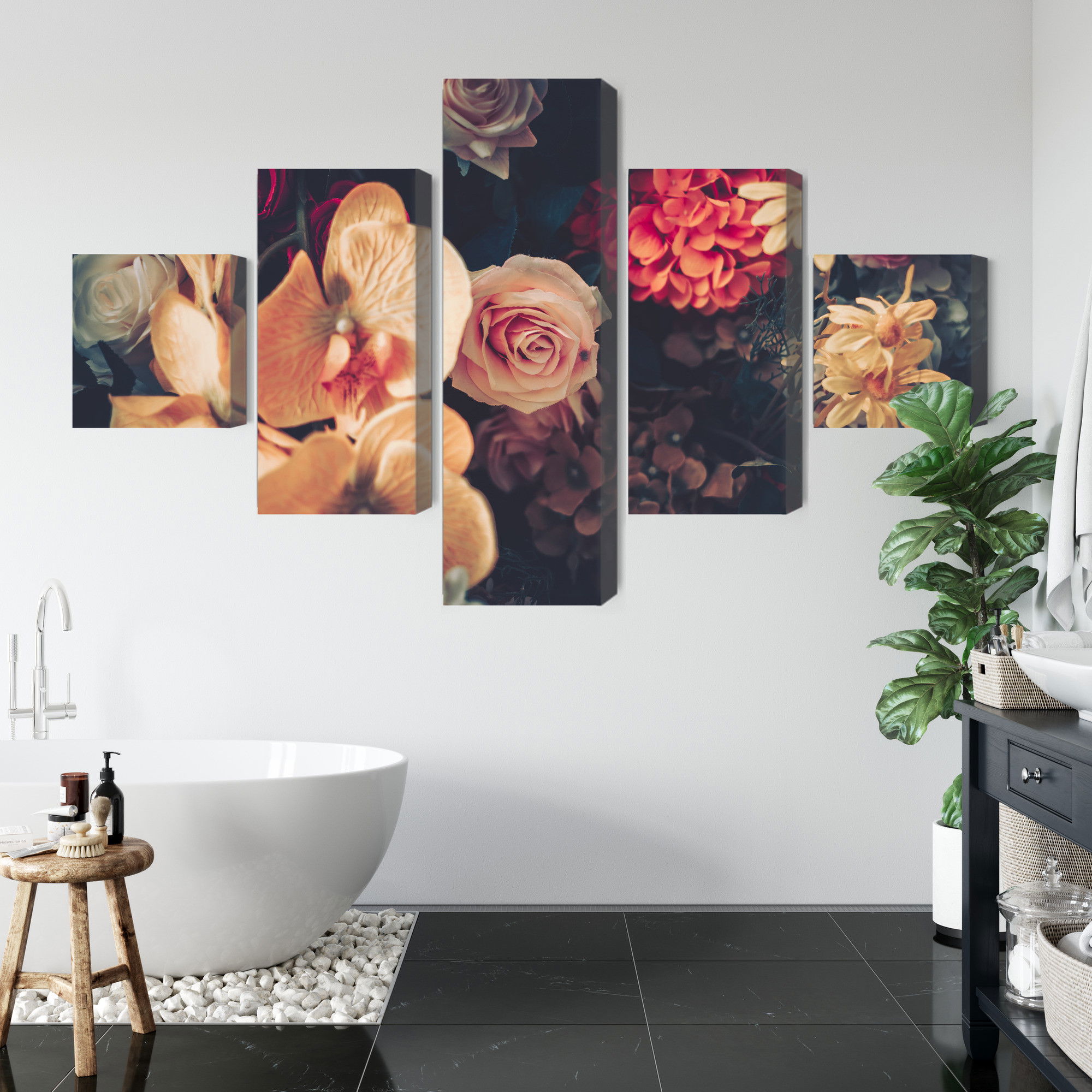 Varje tavla monteras på en massiv fururam. Format upp till 70×50 cm har en ram på 15 mm, medan format från 90×60 cm och uppåt har en ram på 20 mm. Den exakta dukspänningen gör att tavlan håller sin form över tid. Motivet Multi-colored flowers trycks runt hela ramen vilket ger ett stilrent galleriuttryck där tavlan är lika vacker från sidan som framifrån. Kombinationen av rak dukspänning, rena linjer och korrekt tryck ger en professionell finish.