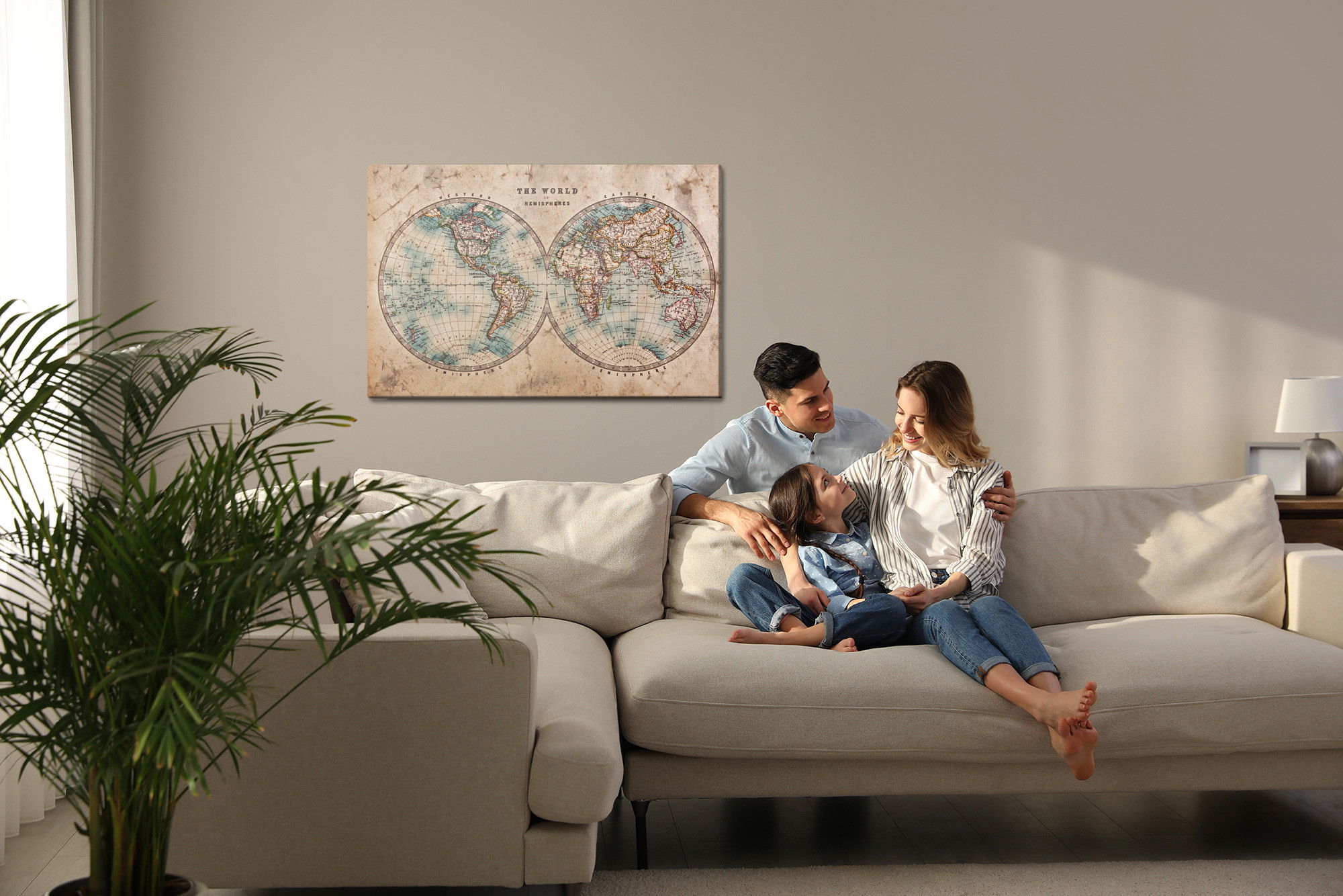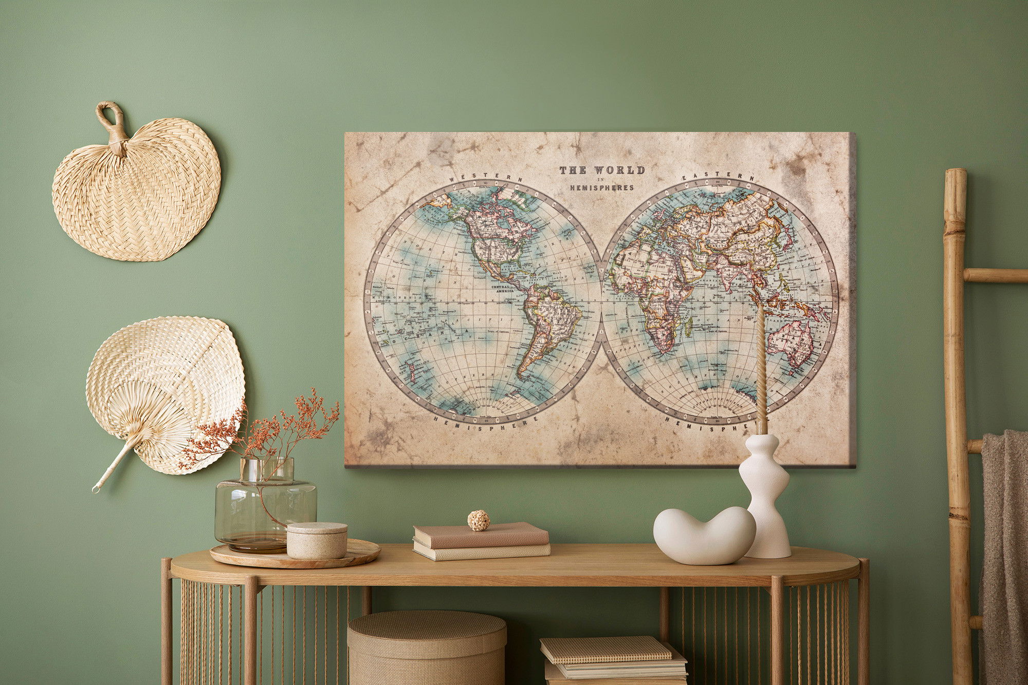 Motivet Old world map in retro style återges med hög färgprecision och detaljrikedom tack vare HP Latex-teknologi. Trycket sker med vattenbaserade, luktfria och GREENGUARD Gold-certifierade bläck som ger en upplösning på upp till 300 DPI. Färgerna är UV-beständiga och behåller sin styrka även i ljusa rum, vilket gör tavlan lämplig för både hem- och offentliga miljöer.