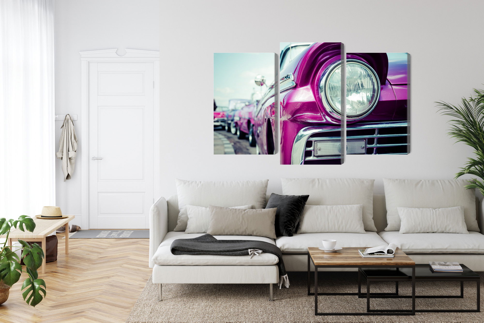 SilentDirects ljuddämpande tavla Retro style car headlight kombinerar ett högupplöst motiv med avancerad akustikteknik. Varje tavla monteras i Sverige och bygger på en stabil canvastavla med fururam, där insidan av ramen fylls med en ljudabsorberande kärna av återvunnen polyester. Konstruktionen gör tavlan till ett både estetiskt och funktionellt inslag i rummet.