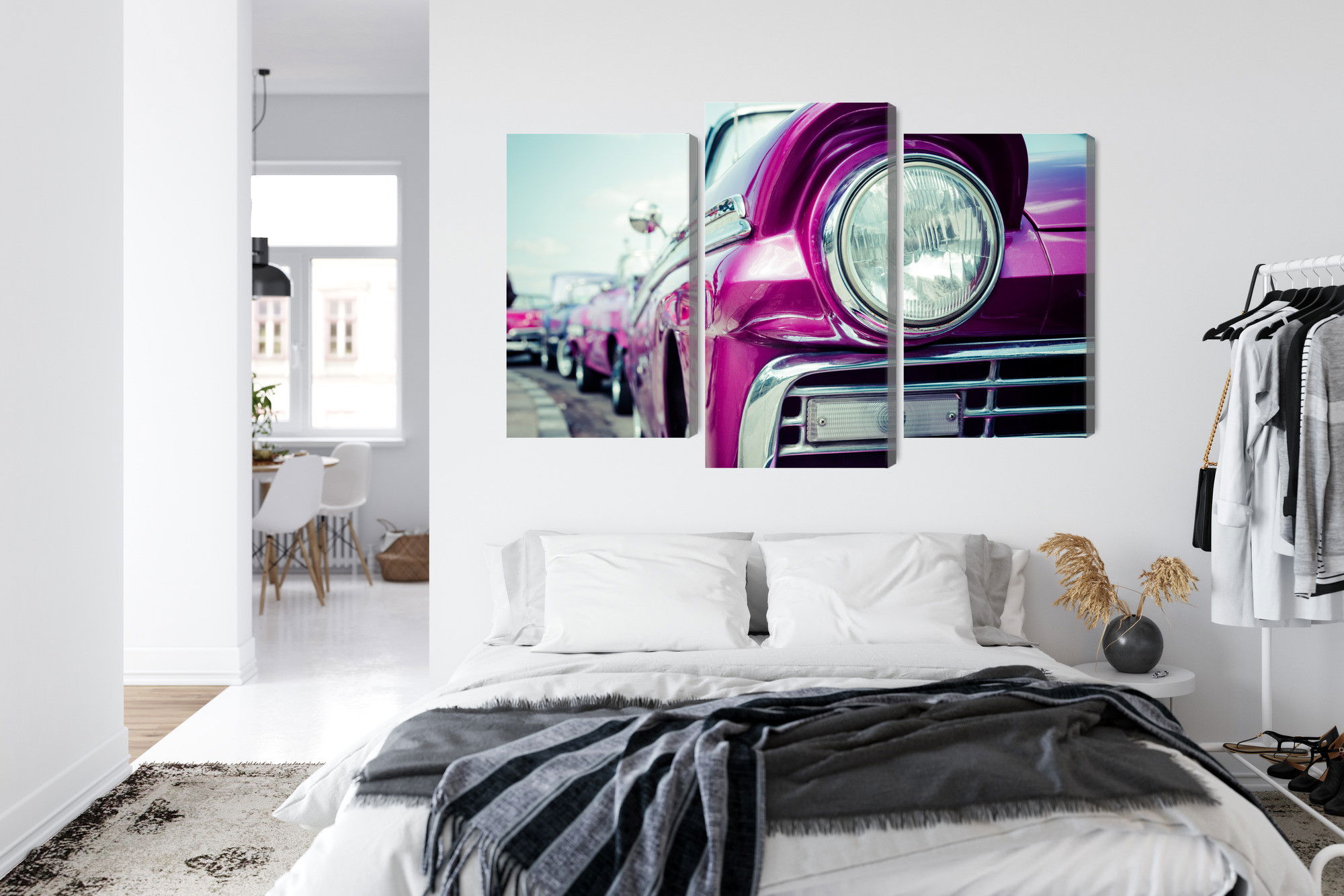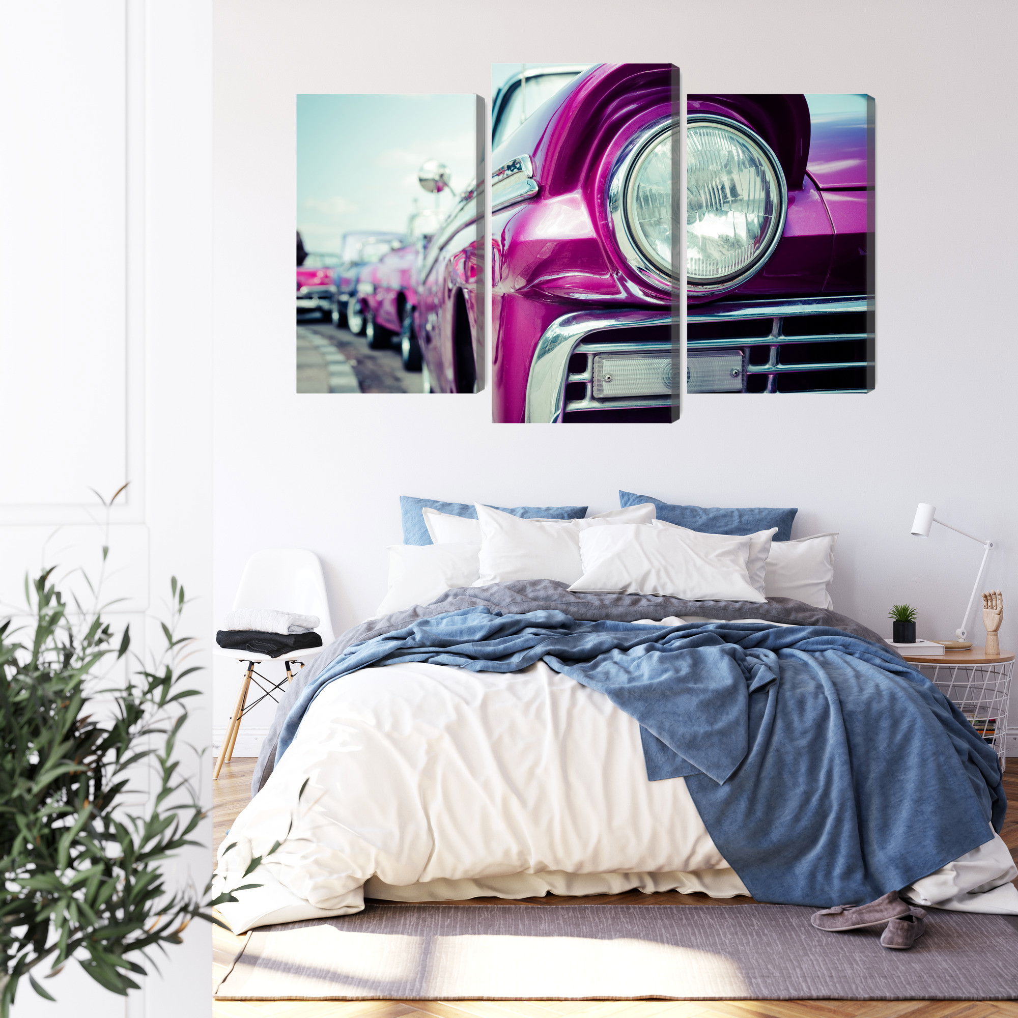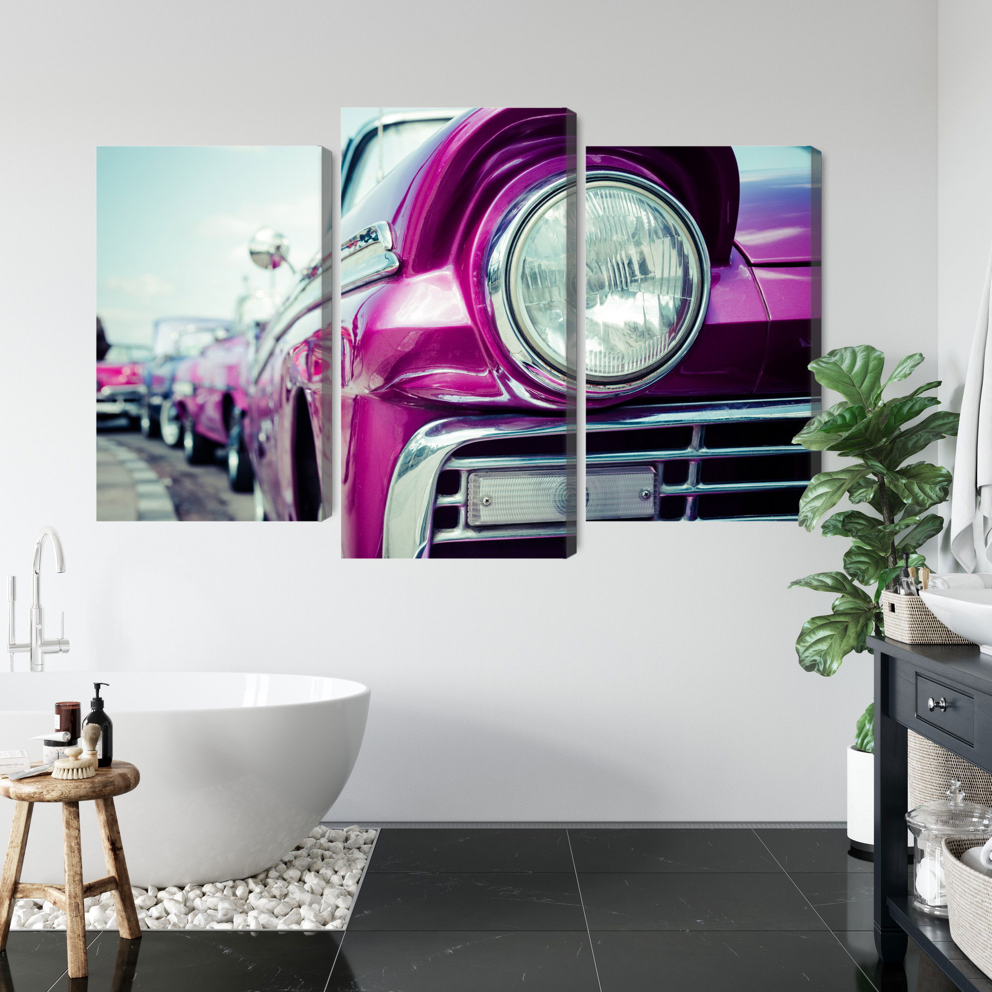 Varje tavla monteras på en massiv fururam. Format upp till 70×50 cm har en ram på 15 mm, medan format från 90×60 cm och uppåt har en ram på 20 mm. Den exakta dukspänningen gör att tavlan håller sin form över tid. Motivet Retro style car headlight trycks runt hela ramen vilket ger ett stilrent galleriuttryck där tavlan är lika vacker från sidan som framifrån. Kombinationen av rak dukspänning, rena linjer och korrekt tryck ger en professionell finish.
