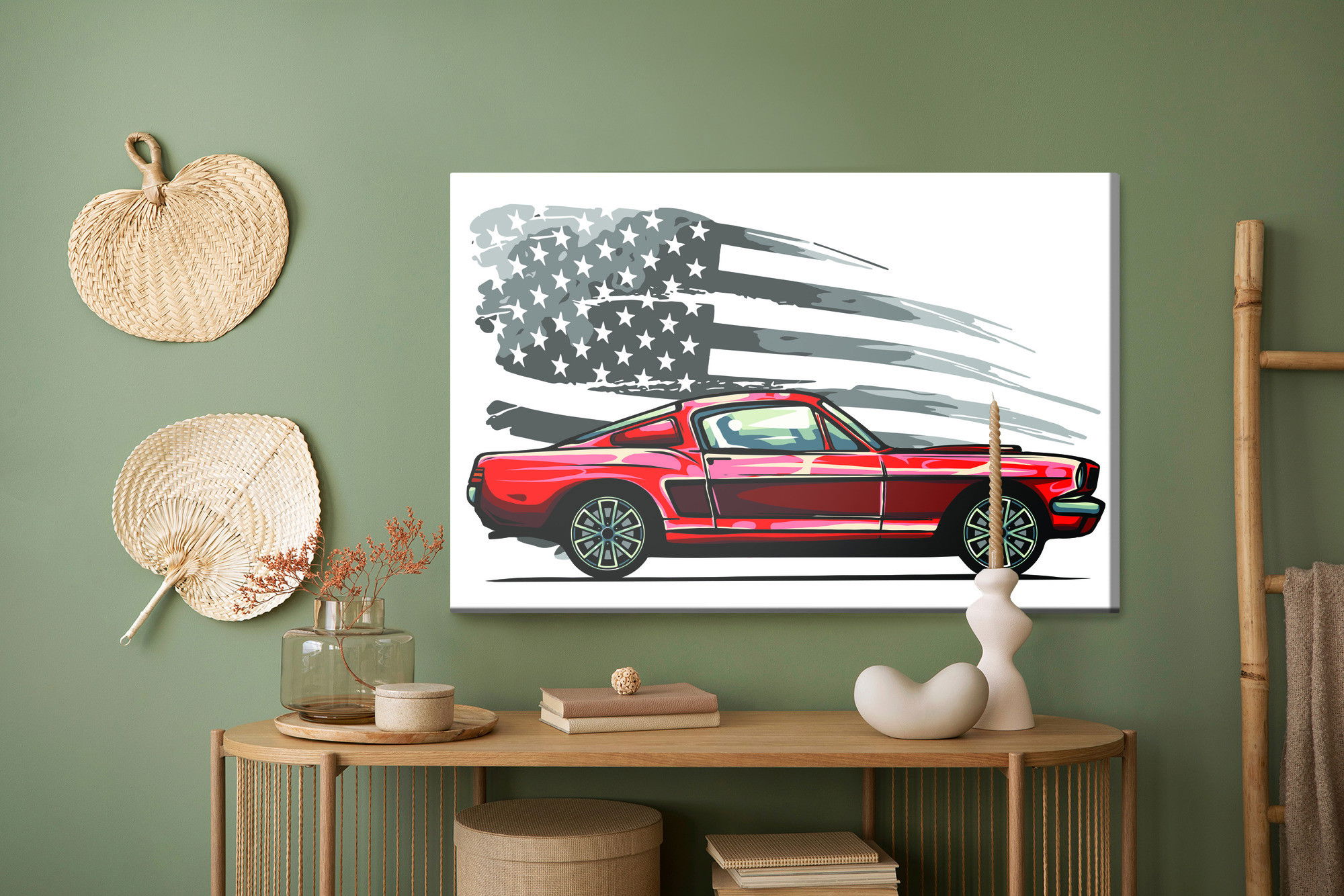 SilentDirects ljuddämpande tavla Sports car on a gray retro kombinerar ett högupplöst motiv med avancerad akustikteknik. Varje tavla monteras i Sverige och bygger på en stabil canvastavla med fururam, där insidan av ramen fylls med en ljudabsorberande kärna av återvunnen polyester. Konstruktionen gör tavlan till ett både estetiskt och funktionellt inslag i rummet.