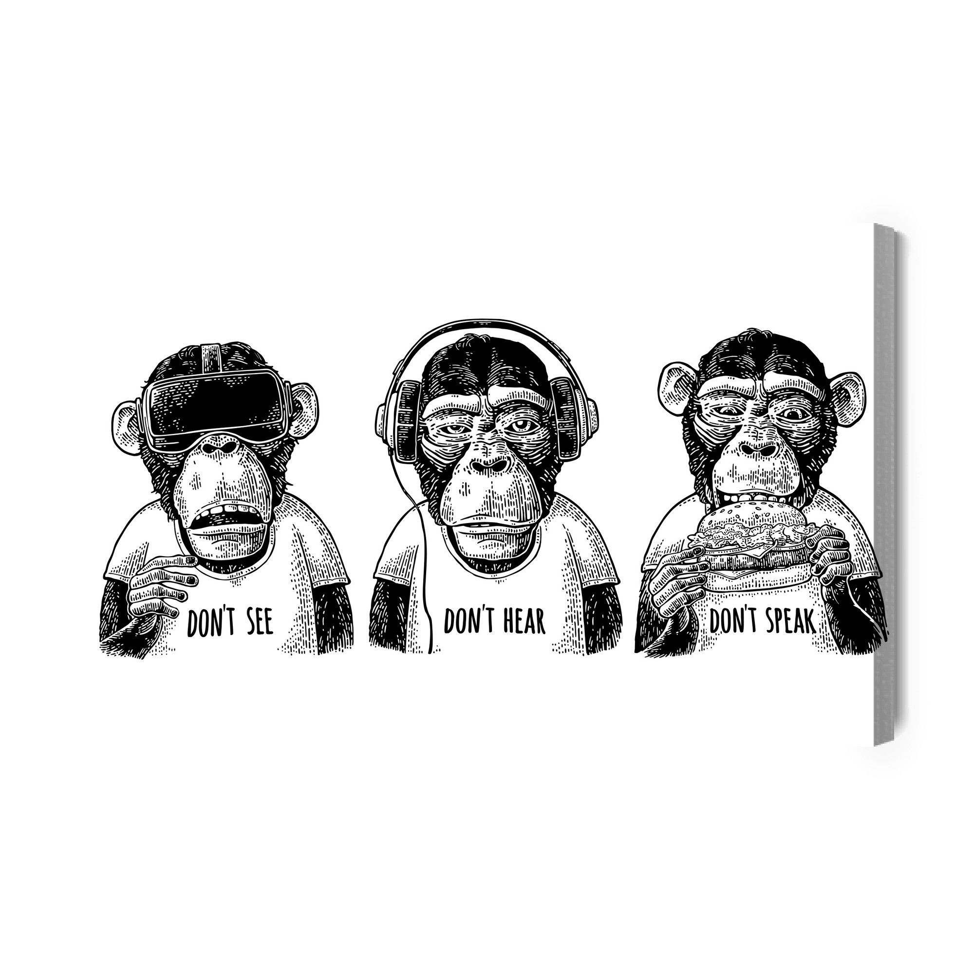 Varje tavla monteras på en massiv fururam. Format upp till 70×50 cm har en ram på 15 mm, medan format från 90×60 cm och uppåt har en ram på 20 mm. Den exakta dukspänningen gör att tavlan håller sin form över tid. Motivet Three monkeys in vintage trycks runt hela ramen vilket ger ett stilrent galleriuttryck där tavlan är lika vacker från sidan som framifrån. Kombinationen av rak dukspänning, rena linjer och korrekt tryck ger en professionell finish.