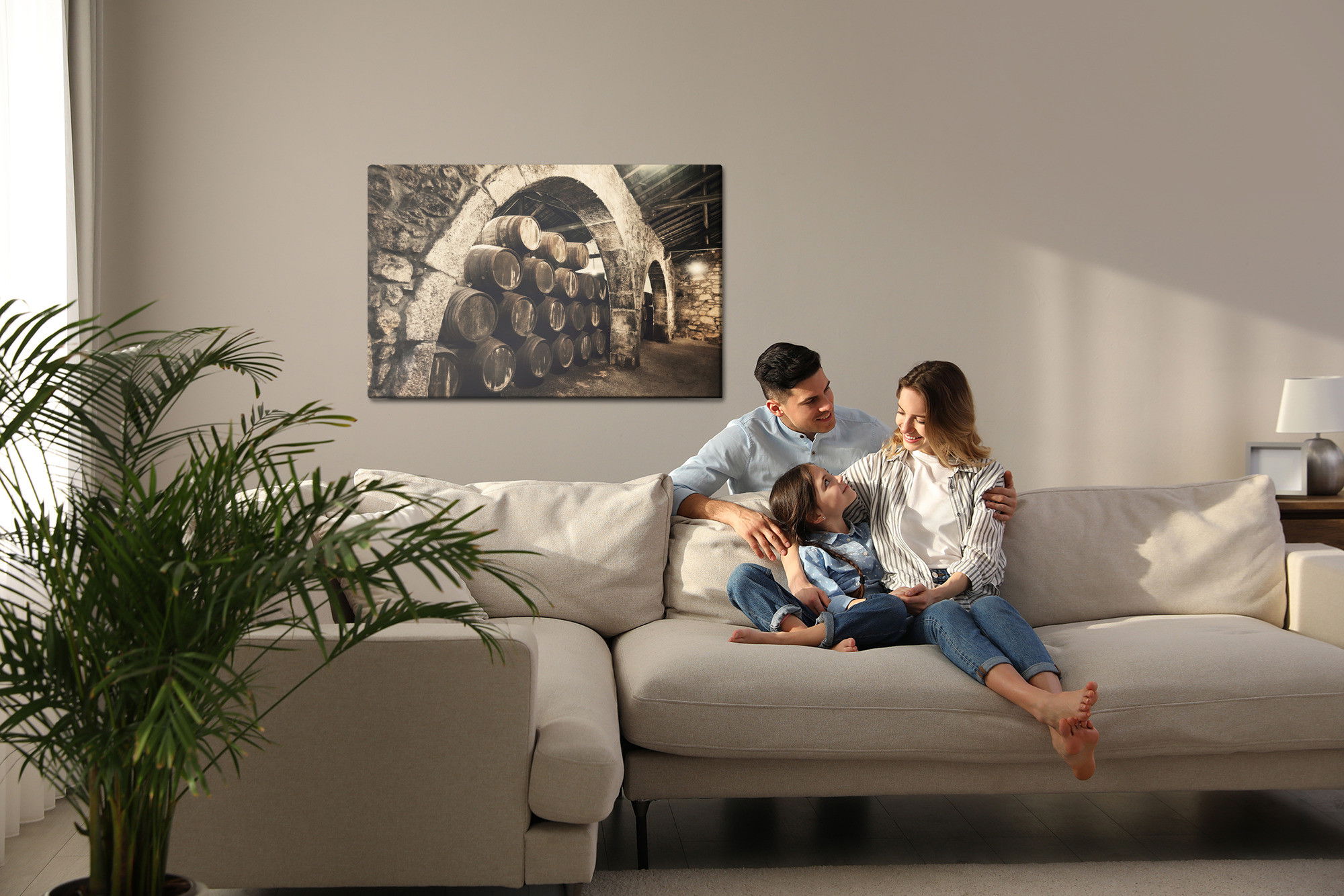 Varje tavla monteras på en massiv fururam. Format upp till 70×50 cm har en ram på 15 mm, medan format från 90×60 cm och uppåt har en ram på 20 mm. Den exakta dukspänningen gör att tavlan håller sin form över tid. Motivet Wine barrels in an old retro trycks runt hela ramen vilket ger ett stilrent galleriuttryck där tavlan är lika vacker från sidan som framifrån. Kombinationen av rak dukspänning, rena linjer och korrekt tryck ger en professionell finish.